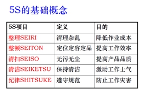 “5S现场管理法”,是一种企业管理模式,它是由日本企业扩展而来:5S即整理(SEIRI)、整顿(SEITON)、清扫(SEISO)、清洁(SEIKETSU)、素养(SHITSUKE),又被称为“五常法则”或“五常法”。是现代工厂管理行之有效的现场管理理念和方法,其作用是:保证安全,提高效率,降低成本,保证质量,使工作环境整洁有序,做到品质不良和故障事故以预防为主。5S的本质是一种执行力的企业文化,强调纪律性的文化,作为基础性的5S工作落实,能为其他管理活动提供优质的管理平台。